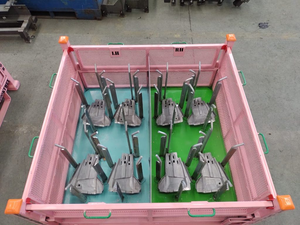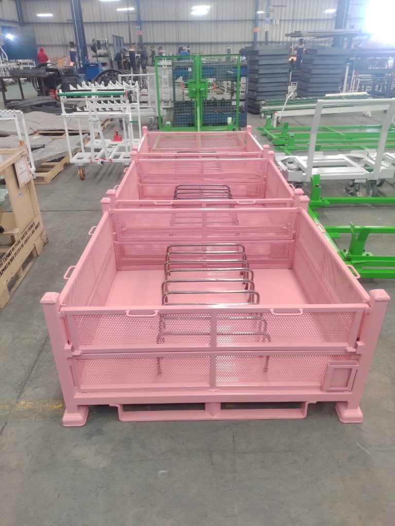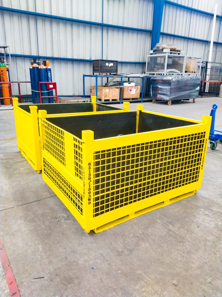 Contenedores metálicos y duraderos para el manejo de piezas, ideales para transporte y almacenamiento en procesos productivos.